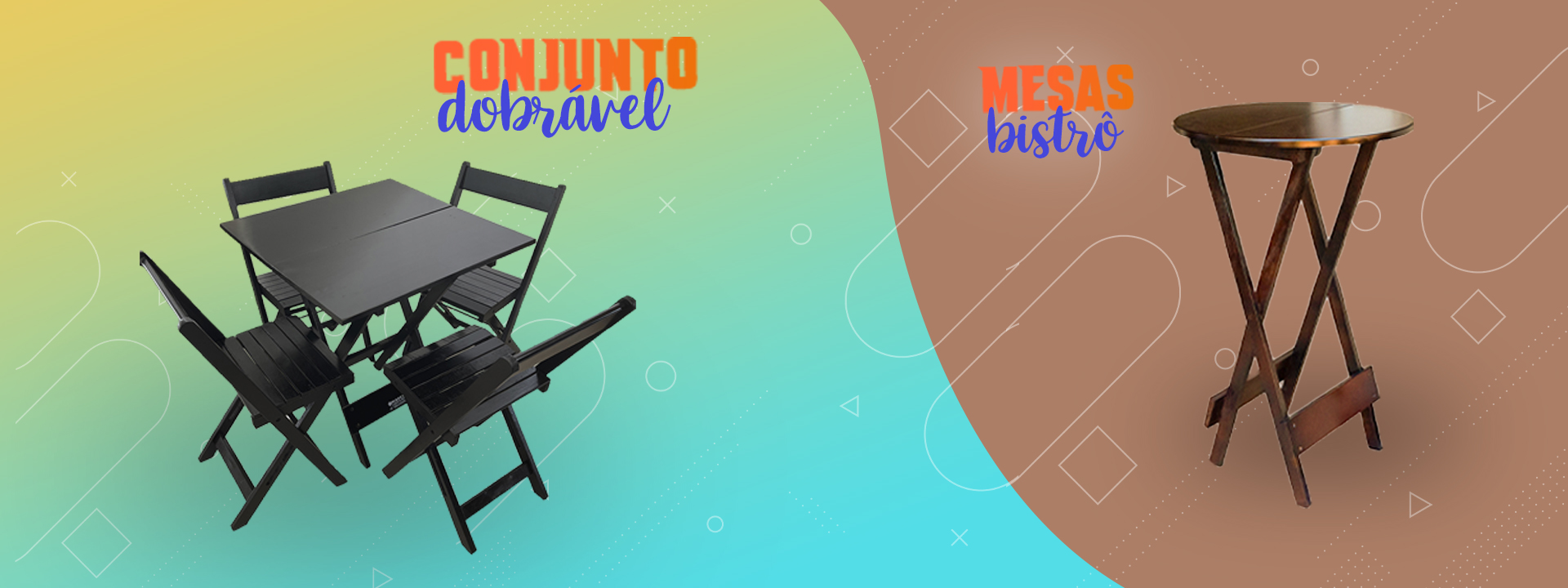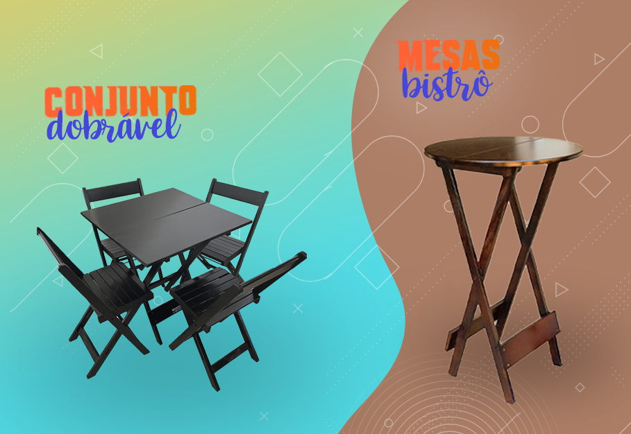 Kit de Mesas Bistrô Dobráveis Quadradas, práticas e funcionais. Ideais para otimizar espaços e proporcionar ambientes versáteis em residências, bares ou restaurantes.